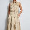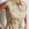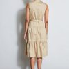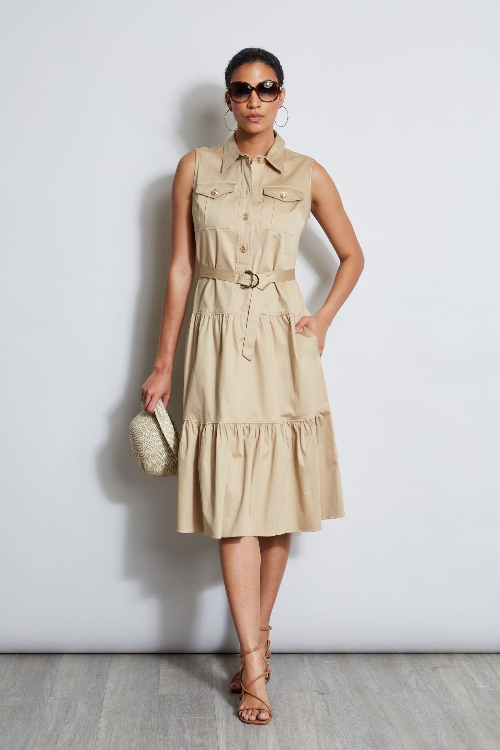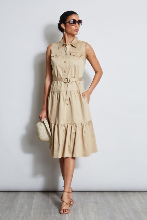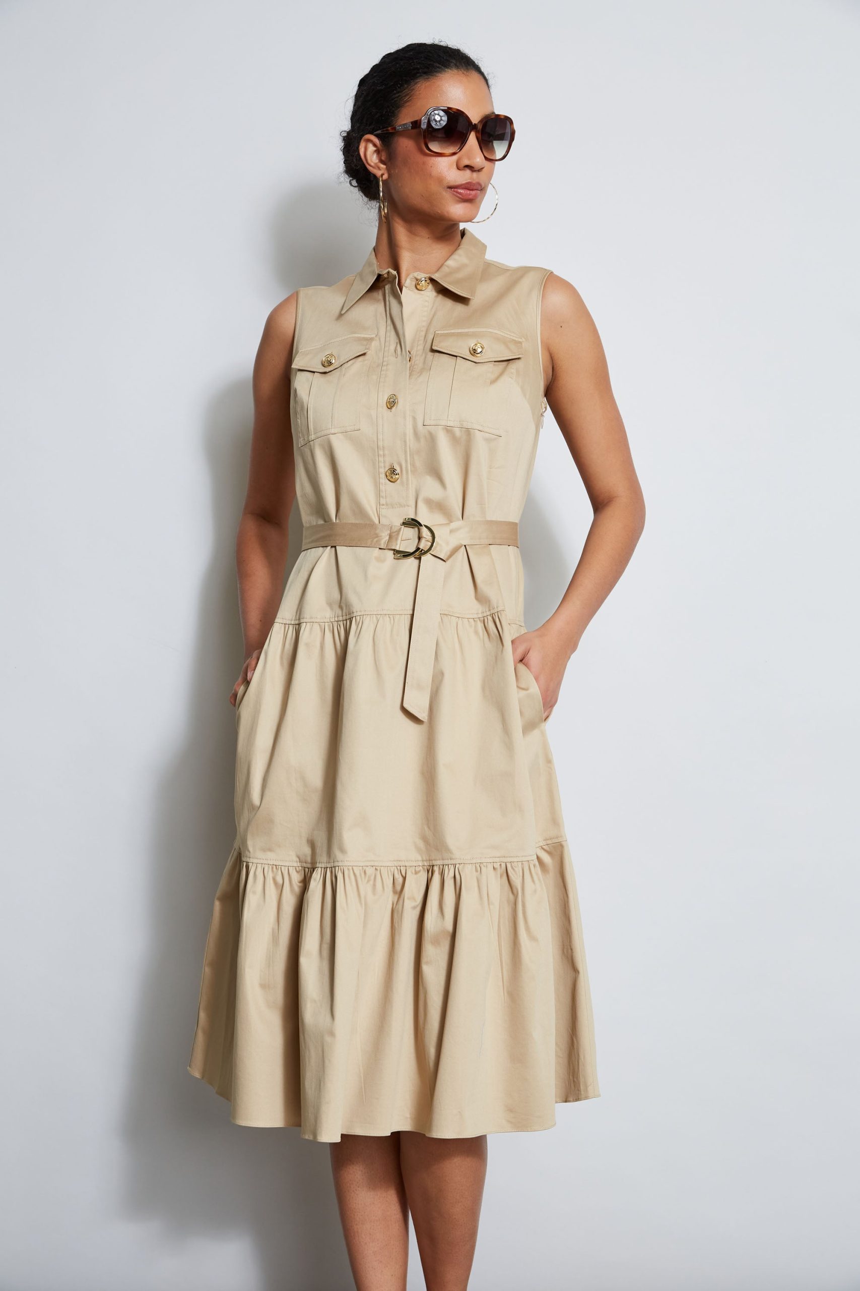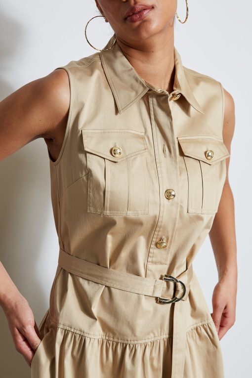 Sleeveless Utility Dress with Crest Buttons, Chest Pockets, a Self Belt and a Tiered Skirt