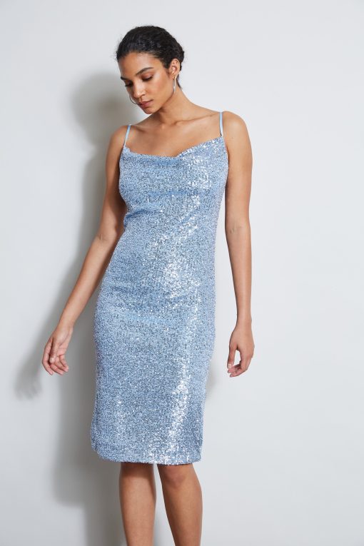 Sleeveless Sequin Dress with Draped Cowl Neckline
