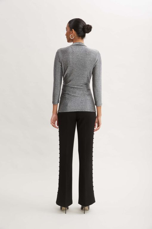 A knit with a cool vibe, nothing beats the chic factor and luxe patina of our metallic knit. Our modern Mock Wrap Metallic Knit has flattering side ruch detailing that gives it a flattering body skimming silhouette. This metallic knit will add style and function to your wardrobe.