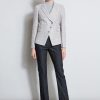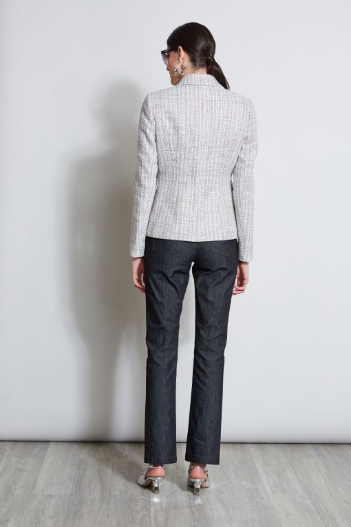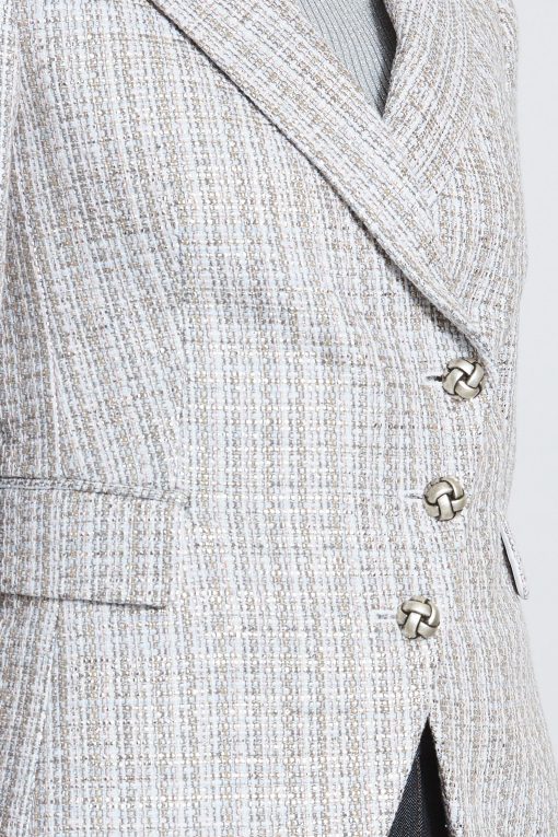 The Double-breasted jacket is reimagined in a modern Italian Metallic Kissed Tweed fabric with a 3 button asymmetrical closure. Designed with a meticulous fit & standout knot buttons, it’s perfect paired with our neutral color pants or dressed down with denim.