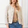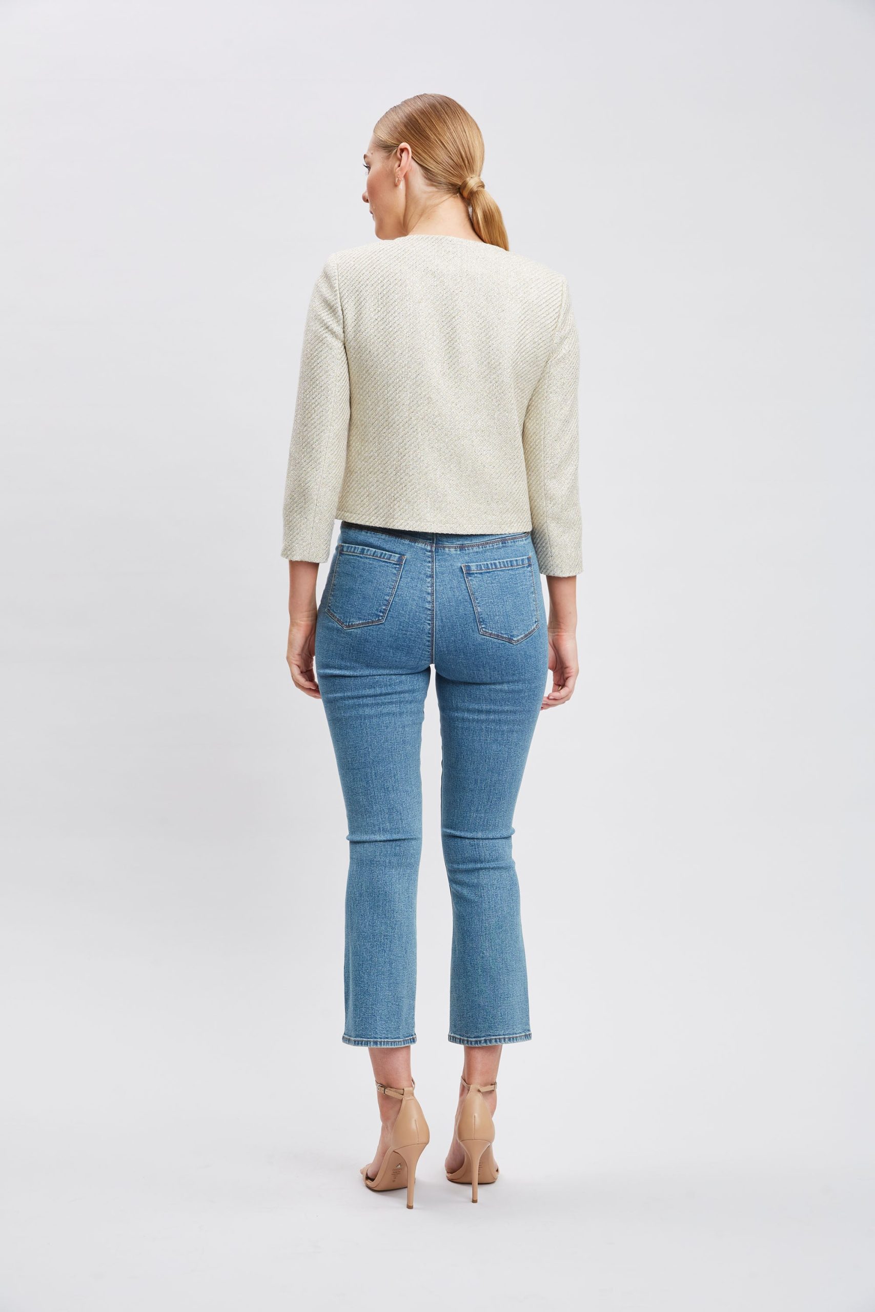 Our Italian tweed jacket has a modern vibe with its cardigan silhouette & crest buttons. Rich in texture, the playful weave and color are great mixed with jeans or worn head to toe with its matching skirt. This jacket elevates every look.