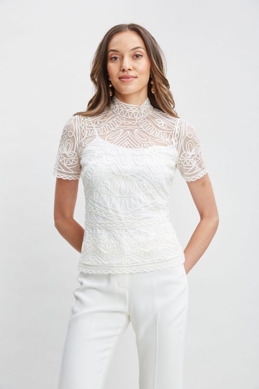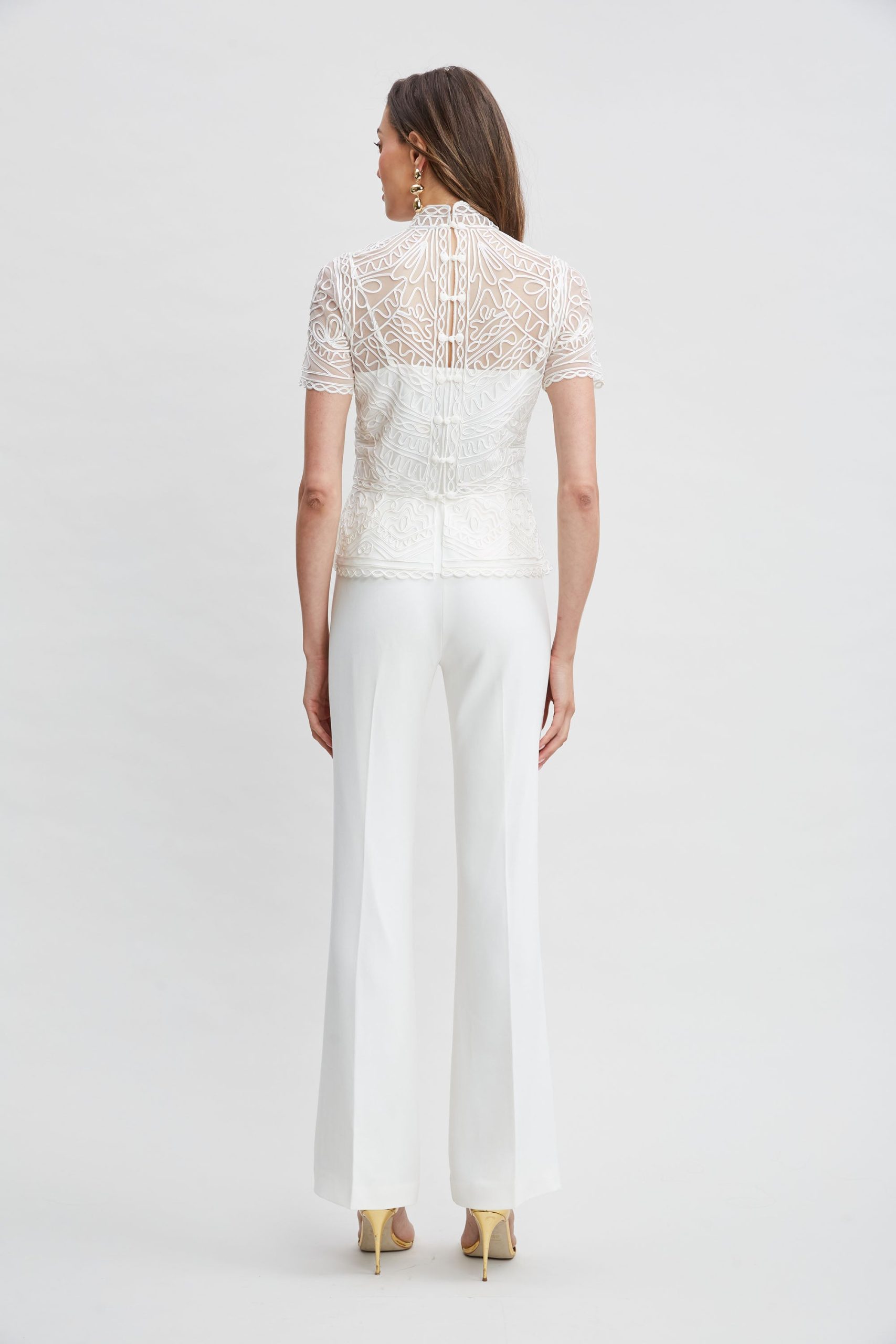 Our Tape Applique Top is a collector’s piece. The artistic geometric design gives this top its designer edge. Designed with short sleeves & a mock neckline, this shirt has a cool vibe that will work in your wardrobe from Fall to Spring. Ultra-Versatile & chic, wear it with Elie ‘s favorite denim, vegan leather or dressed up with our fluid crepe pants.