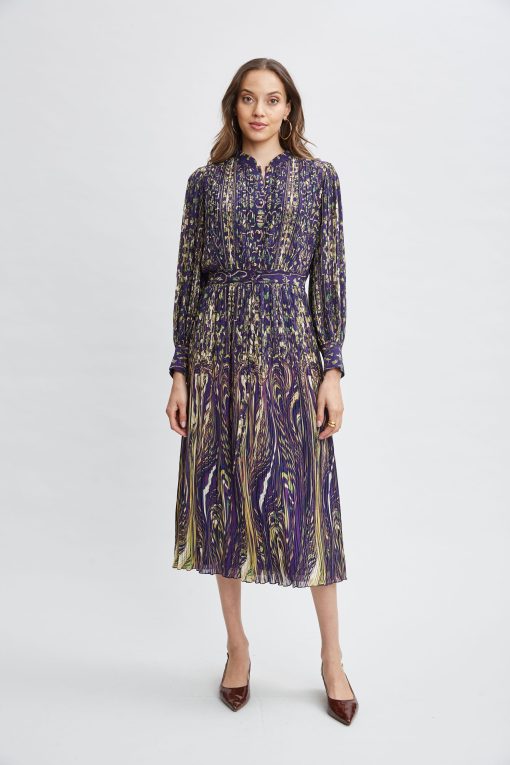 Chic & playful, the pleated details of our luxe Viscose abstract Print dress gives it an artistic edge. Designed in our Sterling Palace Print with full long sleeves & a midi hemline, this dress speaks of a new season. Dress it down with flats or up with sexy sandals for a special occasion.