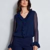 Our long sleeve Silk Georgette Blouson top is bordered in layers of delicate Silk Chiffon ruffles. The romantic expression makes it perfect for date nights and occasions.