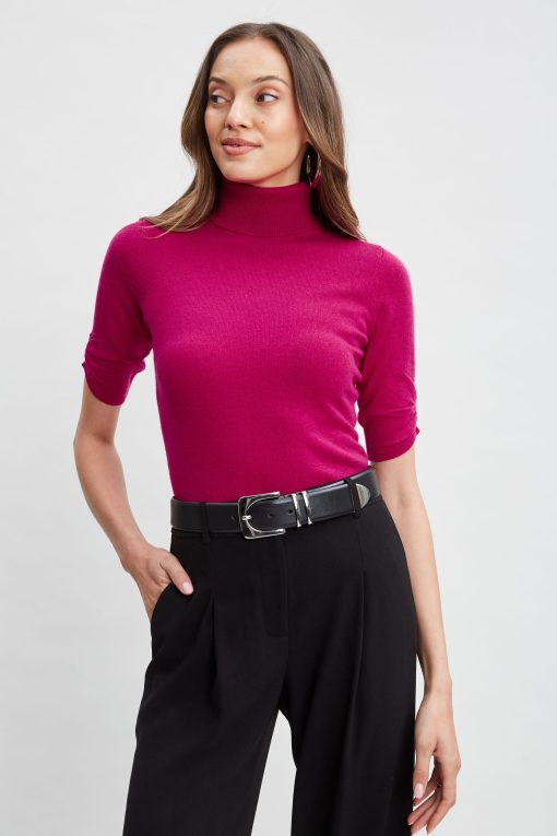 Our Luxe Cashmere Blend Turtleneck Sweater is undeniably soft to the touch and so versatile. The ruching sleeve detail gives it a designer twist – perfect for wearing on its own or layering it for cooler days.