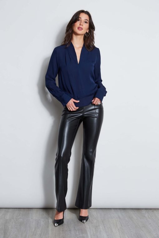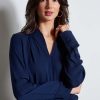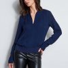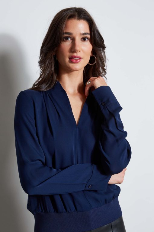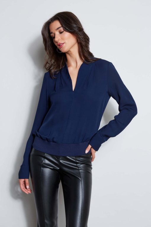 Long Sleeve Silk Top with split neckline & rib hem