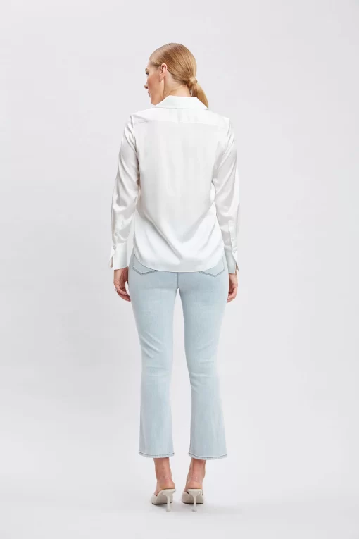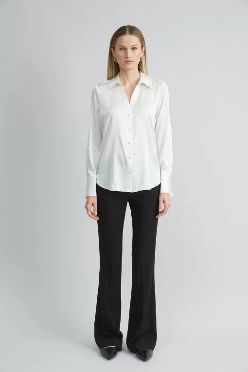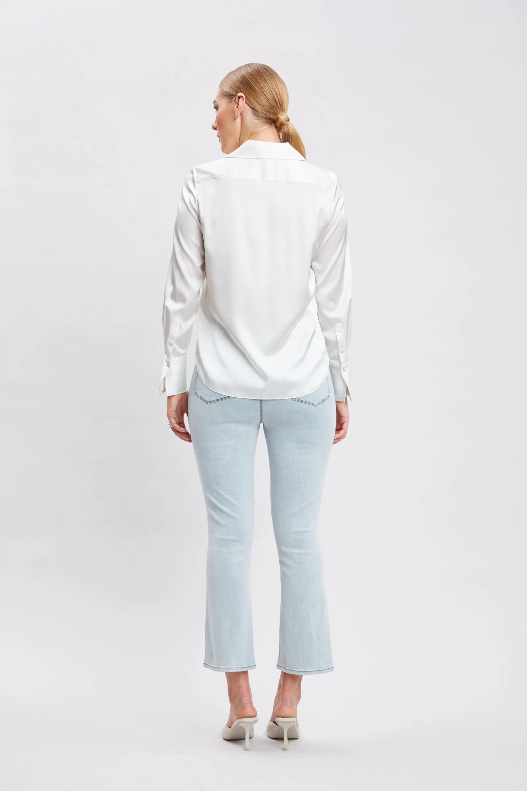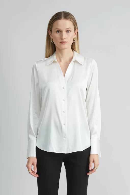 Nothing beats the chic factor and luxe patina of a Silk Satin shirt. Our button-down design features a v-neckline that is perfect for layering under a blazer or wearing on its own- you will live in this shirt all season long.
