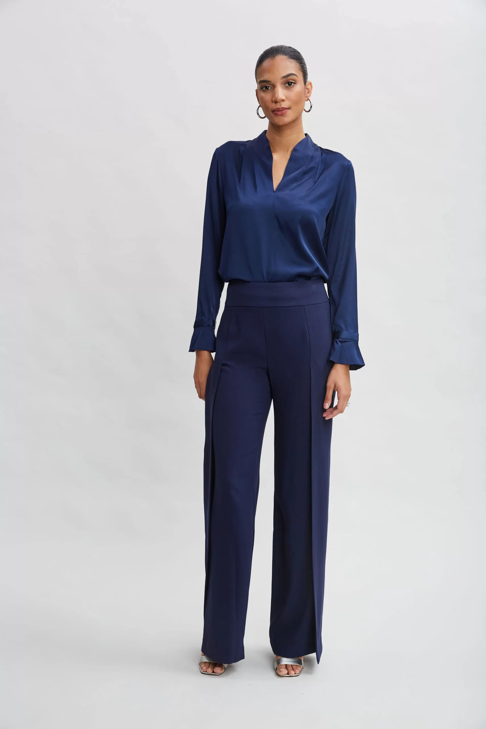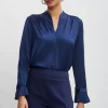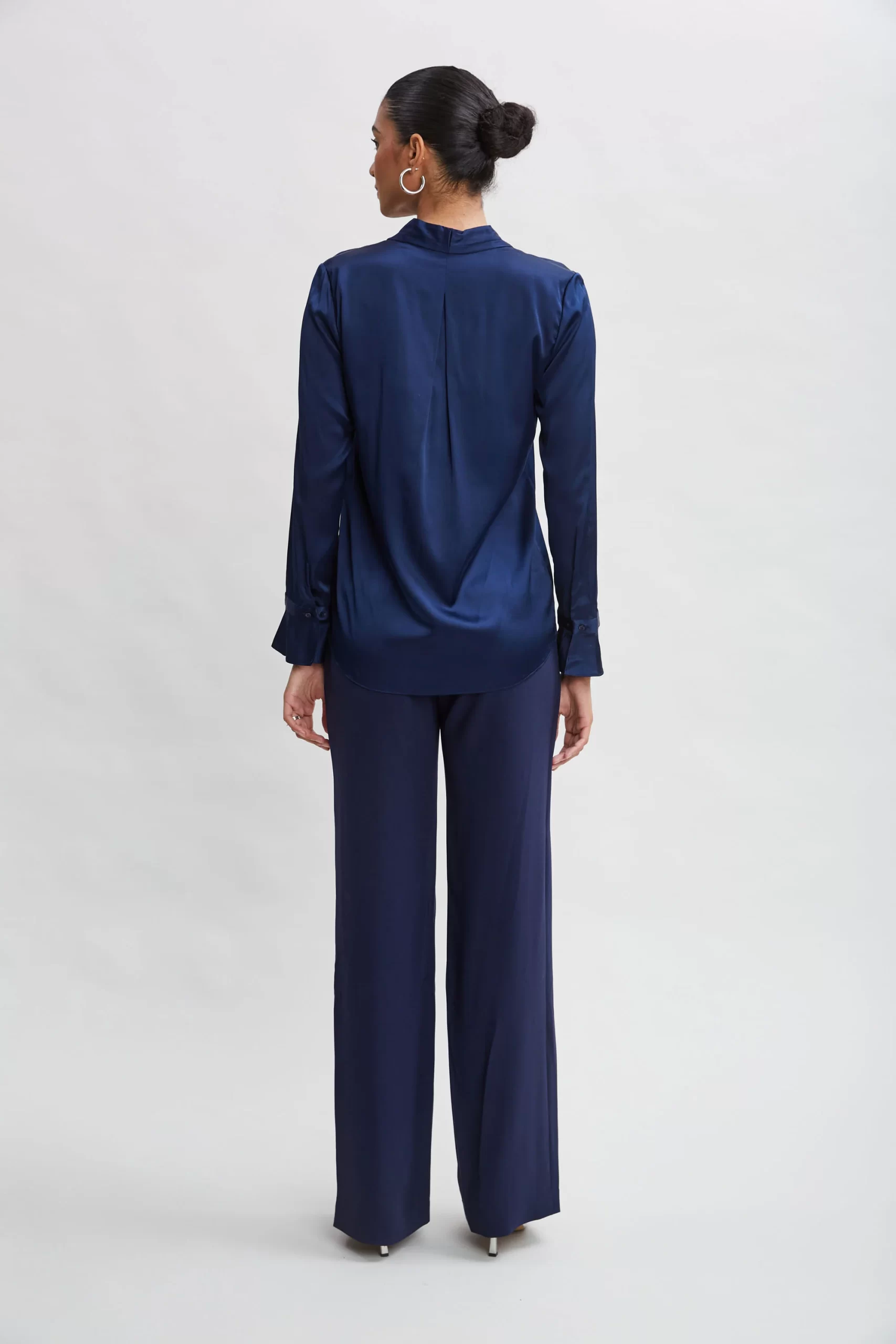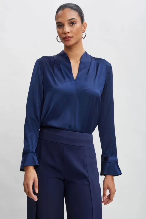 Effortlessly chic, this shirt is destined to become a favorite. Luxurious Silk Satin elevates this minimalist top. With its contour neckline, soft pleat detail & tiered ruffle cuffs, this essential piece will take you from Fall to Spring.