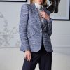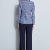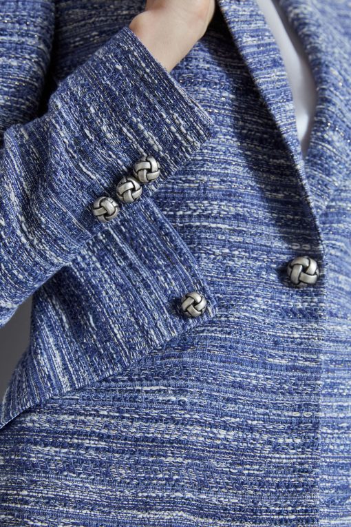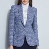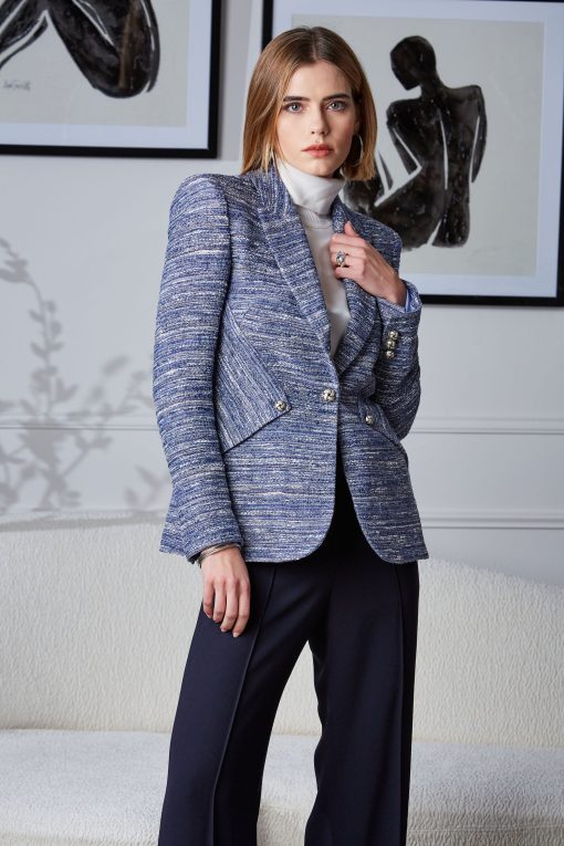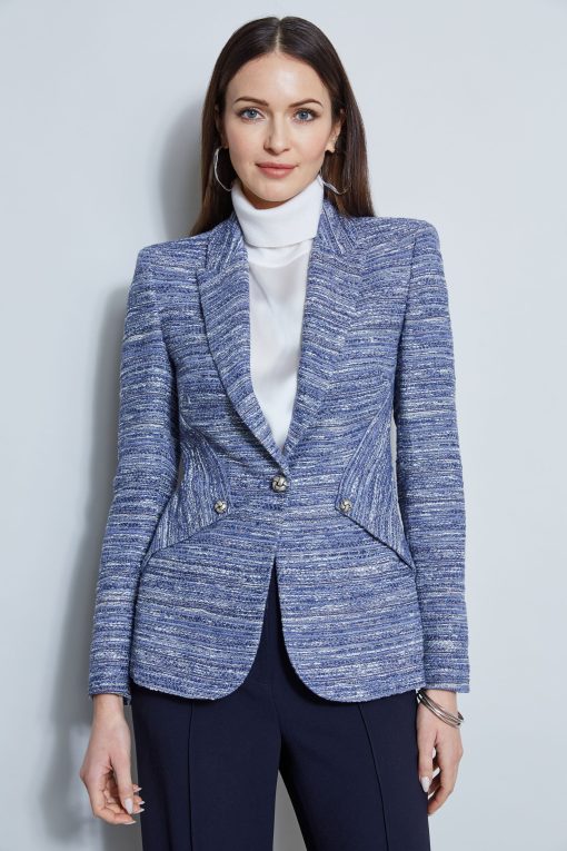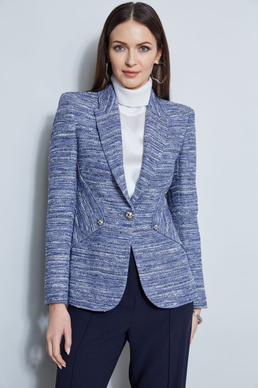 Elie chose a modern Italian metallic kissed tweed fabric for his signature blazer. Single breasted with peaked lapels, the contour side panels lend a body skimming silhouette. Designed with a silver knot button, this blazer has the cool factor you are looking for in your next favorite jacket.